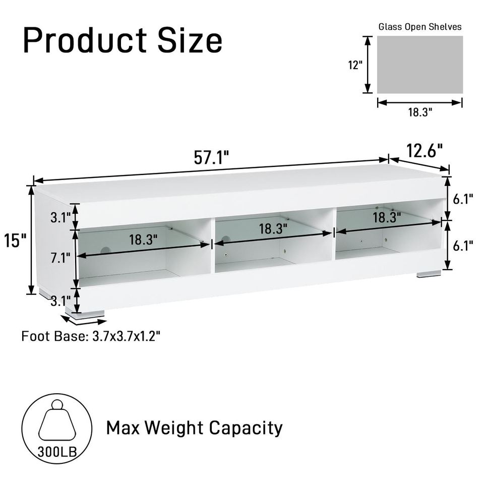 [LARGE STORAGE SPACE] 57.1(L) x 12.6(W) x 15(H) inch, this LED entertainment center accommodates TVs up to 65 inch.